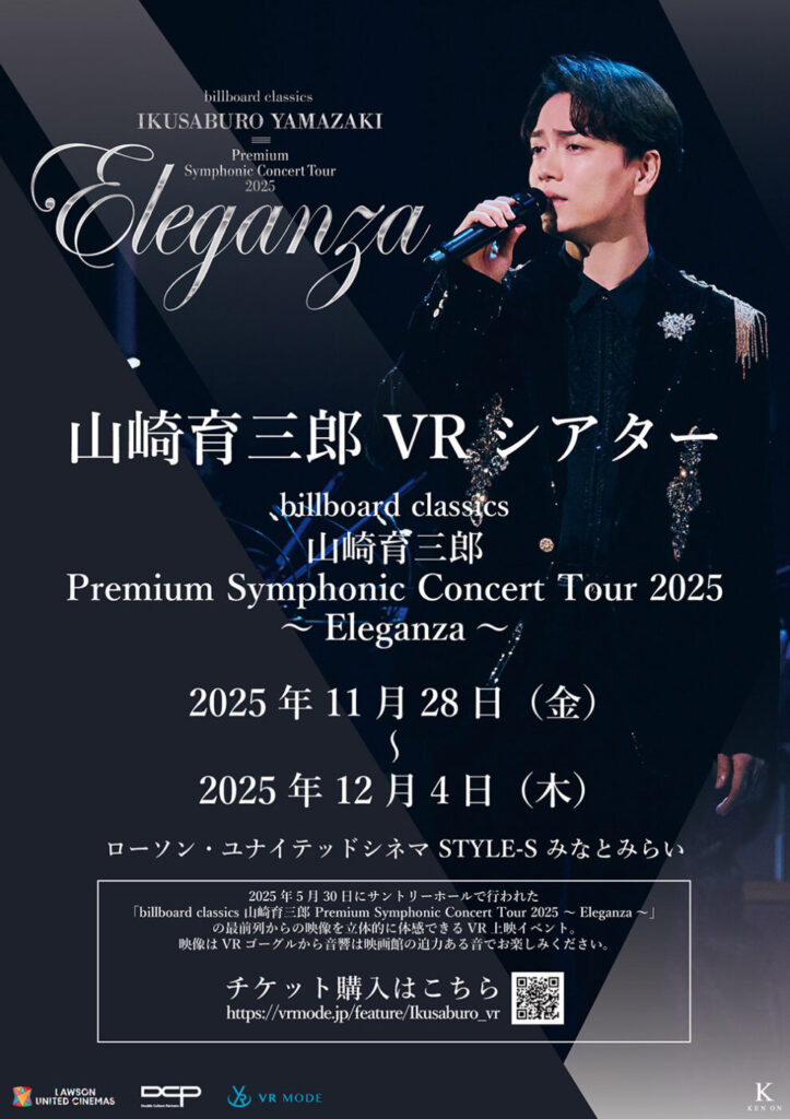 2025年5月30日にサントリーホールで行われた「billboard classics 山崎育三郎 Premium Symphonic Concert Tour 2025 ~Eleganza~」の最前列からの映像を立体的に体感できるVR上映イベントが、2025年11月28日(金)〜12月4日(木)に「ローソン・ユナイテッドシネマ STYLE-S みなとみらい」で開催!